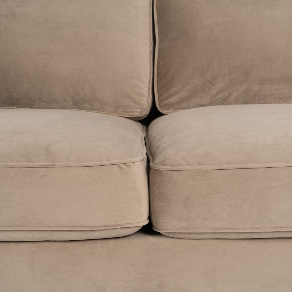 Material: 100% poliéster, veludo. Estrutura: madeira conglomerada – madeira de seringueira Peso: 260g/m2. Pernas: Enchimento: espuma, densidade do assento e encosto: 28-30Kg./m3 Densidade do encosto: 25Kg./m3. Almofadas, assentos e encosto: capas removíveis com zíper. Peso máximo autorizado: 200Kgr. Altura do assento: 50cm. Altura da perna: 19,5cm. Largura do assento: 140cm. Profundidade do assento: 56cm. Altura do encosto: 44cm. Largura do assento com almofadas: 123cm. Altura do apoio de braço (do chão): 71cm. Largura do apoio de braço (do assento): 27cm. Pernas para montar. Possíveis sombras ou marcas no tecido são decorrentes da embalagem das peças. Desaparecendo facilmente com a aplicação de vapor.