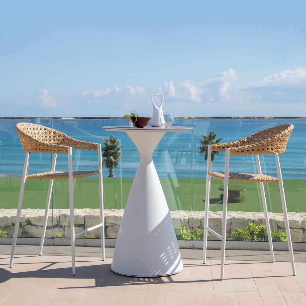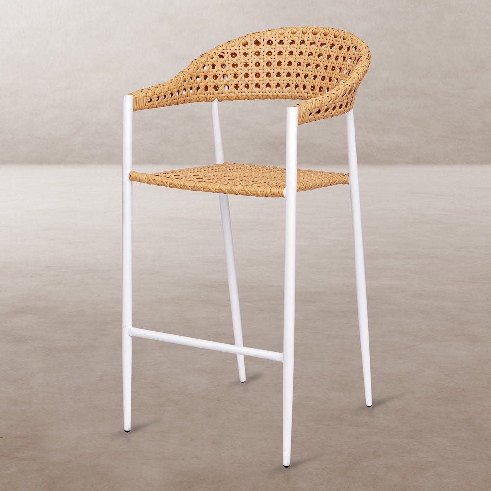 Estrutura em alumínio branco. Encosto e assento em rattan sintético de alta resistência com aparência natural. Design ergonômico e empilhável. Altura do assento: 72 cm. Altura do encosto: 90 cm.