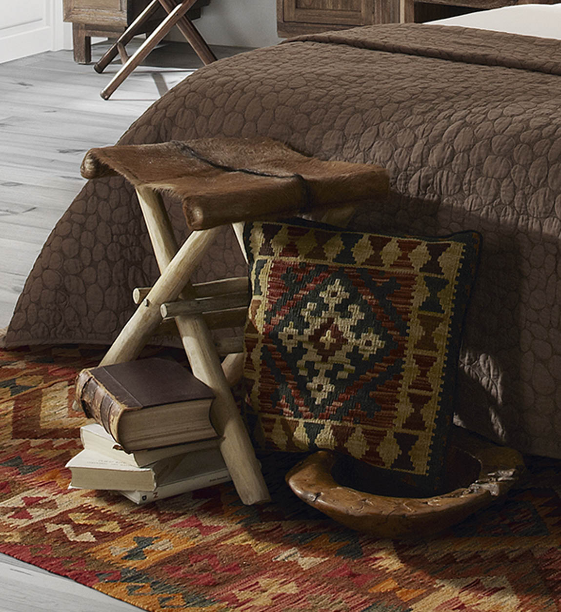 Banqueta dobrável artesanal em madeira maciça de teca e pele de cabra natural. Por ser artesanal com produtos naturais, pode ter variações de cor. Sem necessidade de montagem.