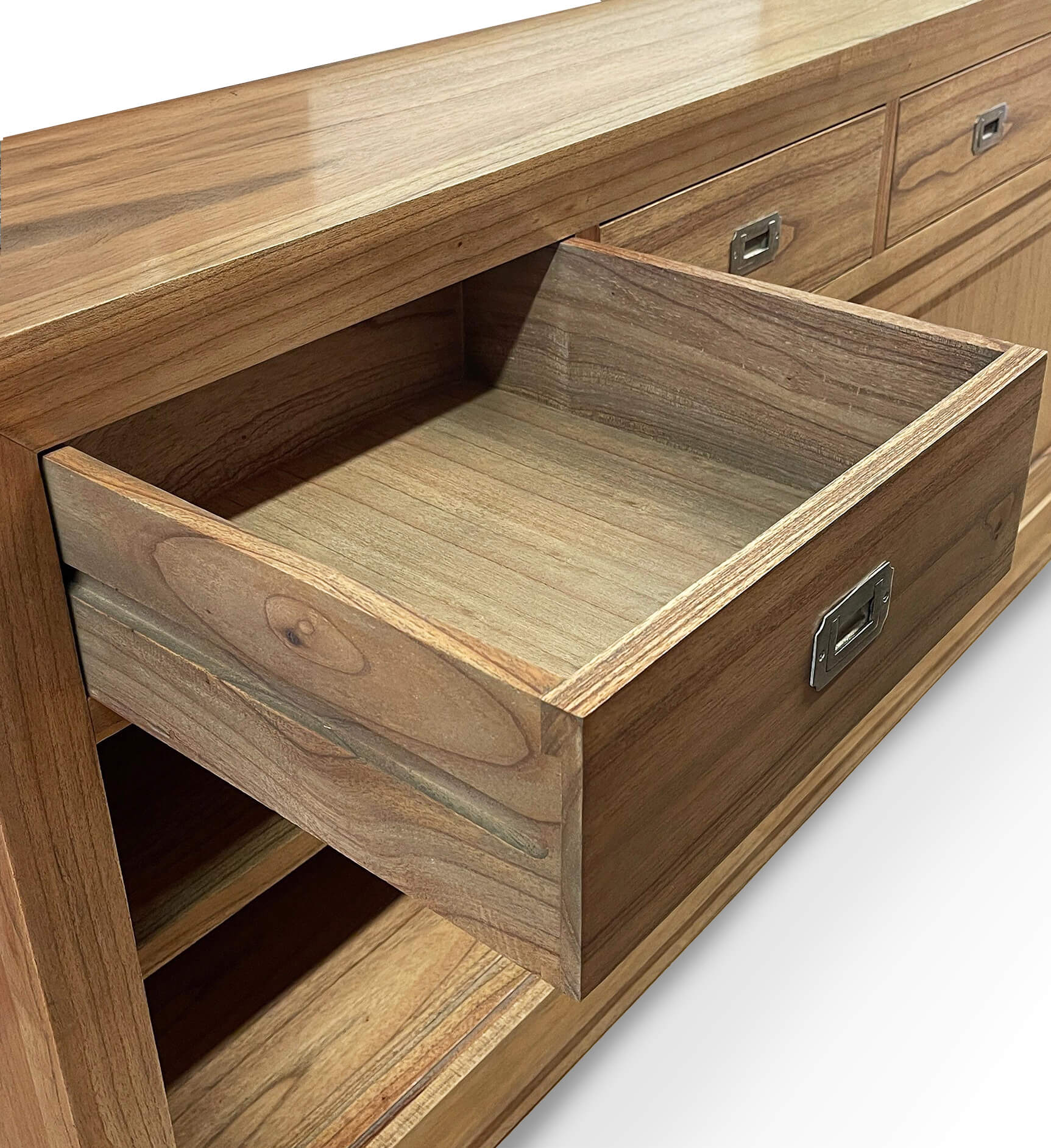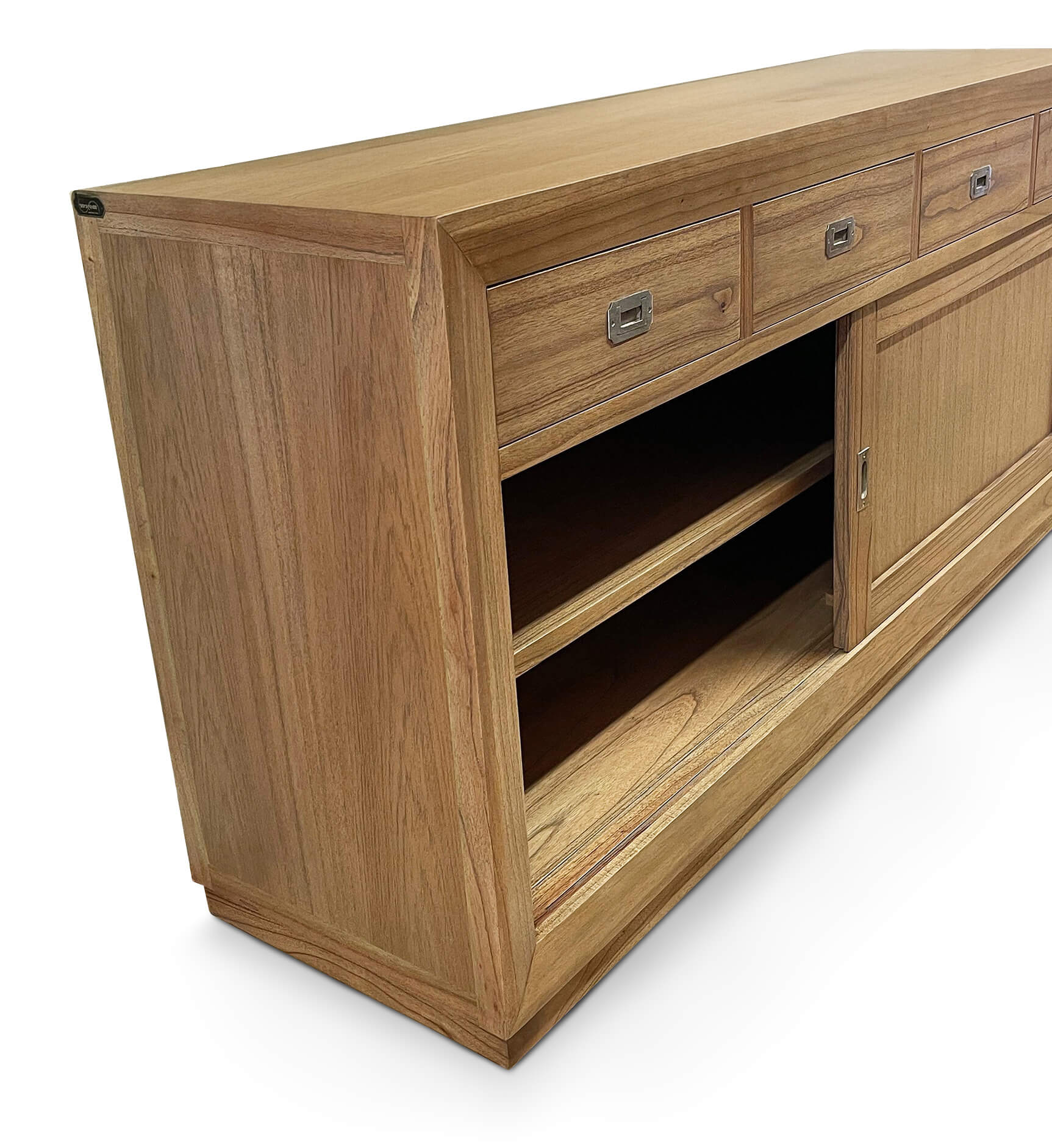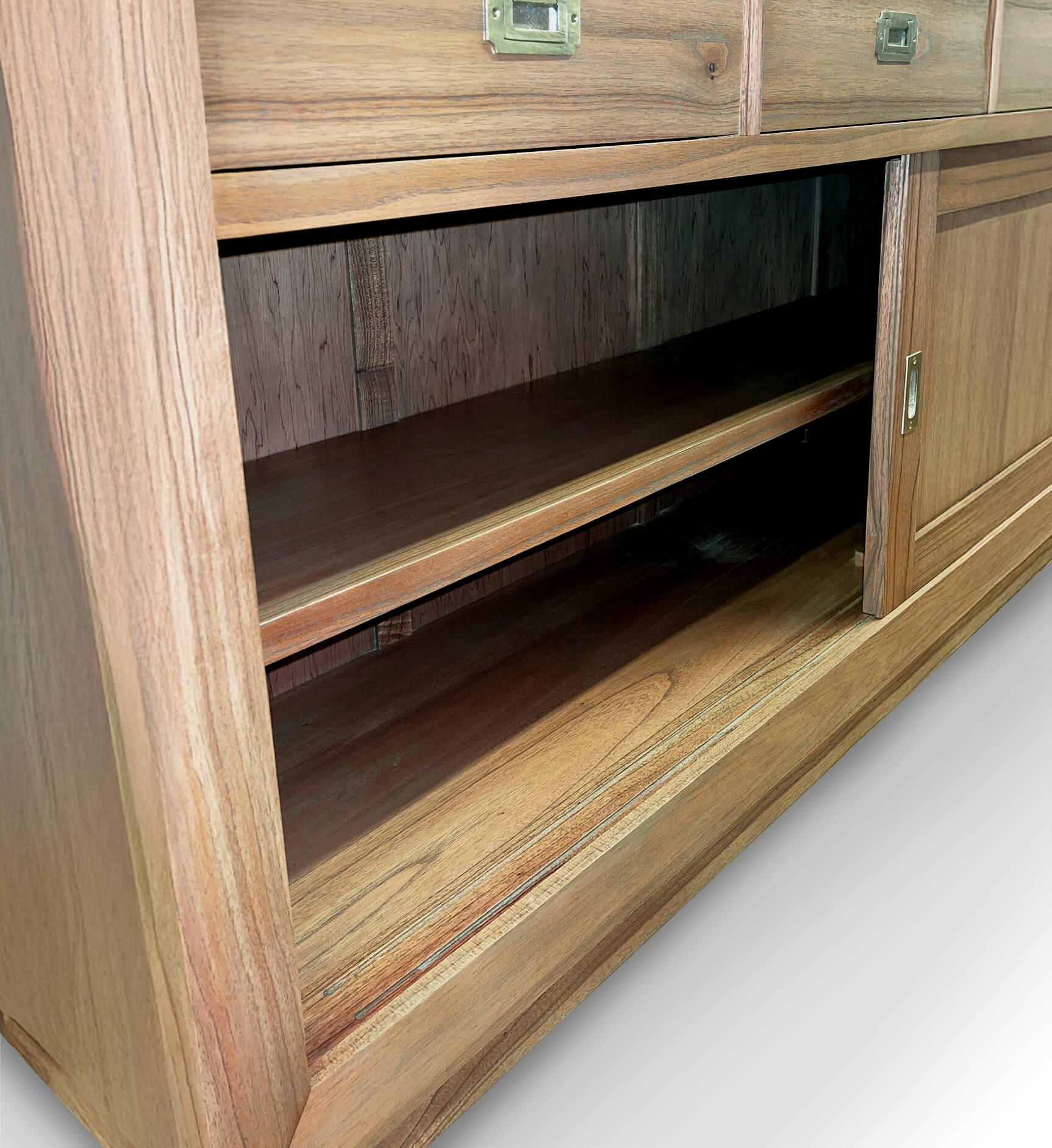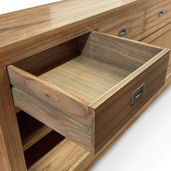 Aparador incluso na coleção Merapi. Feito à mão em madeira de mindi, com estrutura sólida e acessórios em bronze prateado. Possui 4 gavetas centrais e 2 portas de correr com prateleira interna. Sem necessidade de montagem.