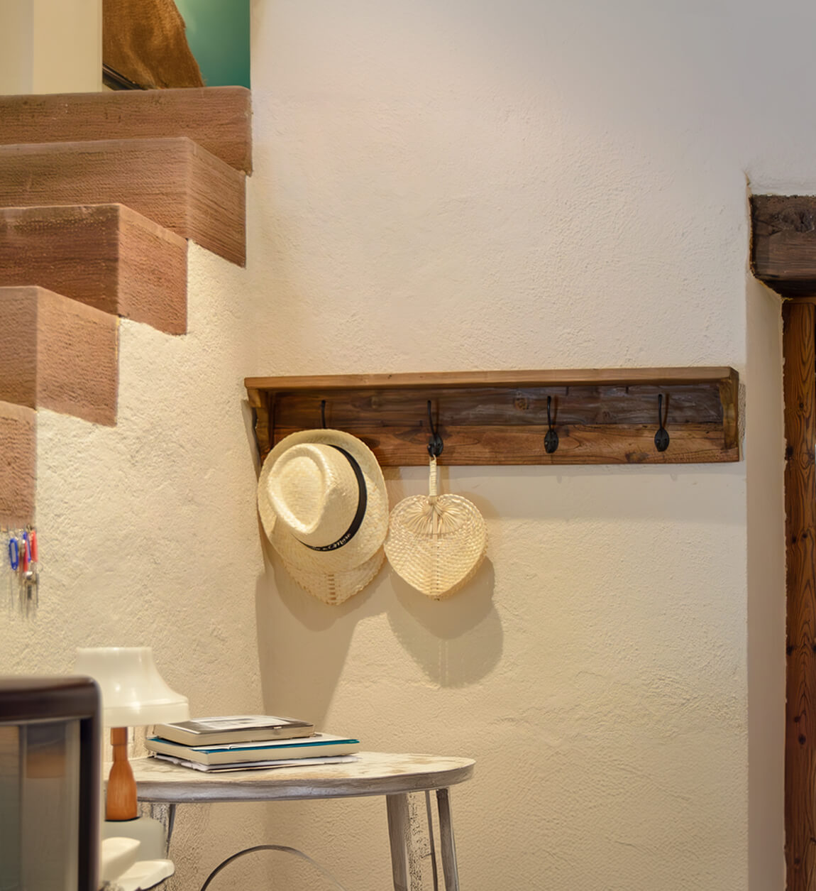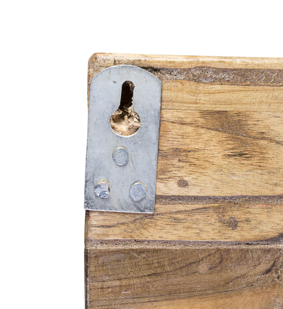 Cabide rústico feito à mão em madeira maciça de teca reciclada. Tem 4 cabides de ferro preto e uma prateleira na parte superior. Por ser um produto artesanal com produtos naturais, pode apresentar variações de cor e forma. Inclui o sistema de fixação à parede e não necessita de montagem.