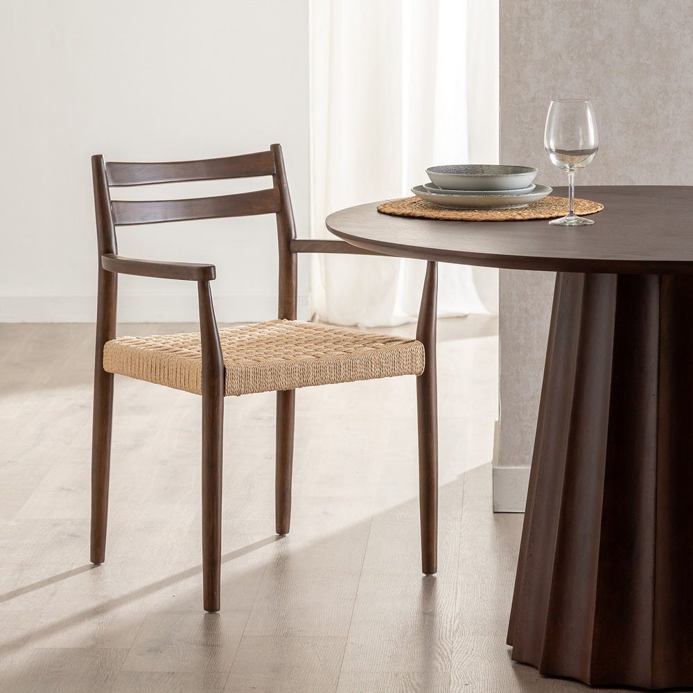 Estrutura em madeira de borracha. Altura do assento: 45cm. Altura das pernas: 40cm Altura do encosto: 34,5cm. Distância entre as pernas: 47cm Altura dos braços ao assento: 18,5cm. Medidas do assento: 51×46,5x5cm Não empilhável. Não é necessária montagem. Cumpre a norma UNE-EN 12520:2015