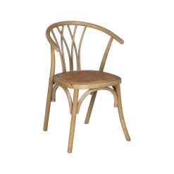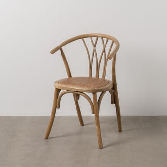 Madeira de olmo. Assento de vime. Altura do assento: 46cm. Altura da perna: 43cm. Altura do encosto: 36cm. Altura aos apoios de braços: 70cm Distância entre pernas: 45cm. Material do assento: Rattan. Enchimento: Espuma. Densidade: 16kg/m3. Não empilhável. Montagem necessária. Peso suportado: 130kgs. Cumpre a norma UNE-EN 16139:2013