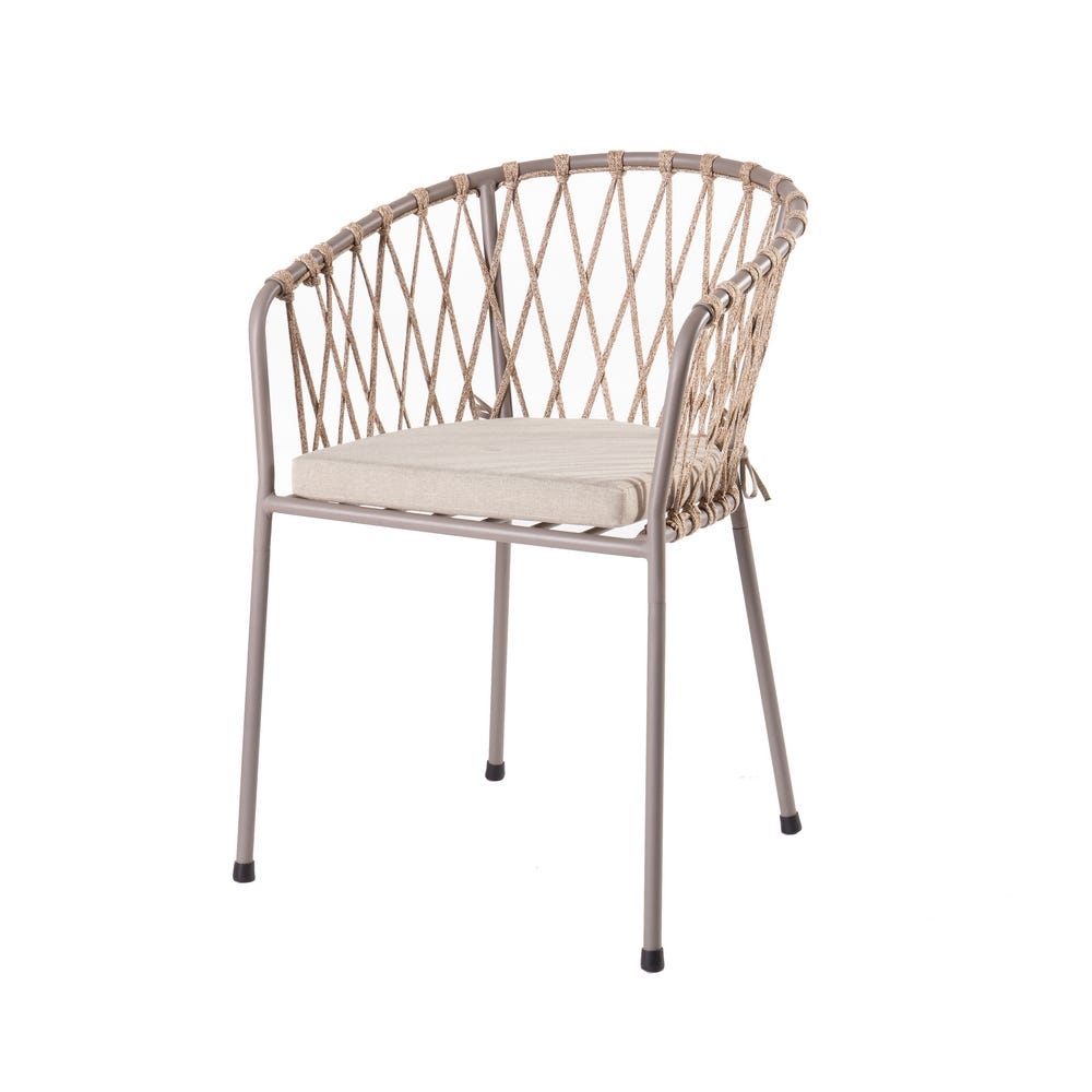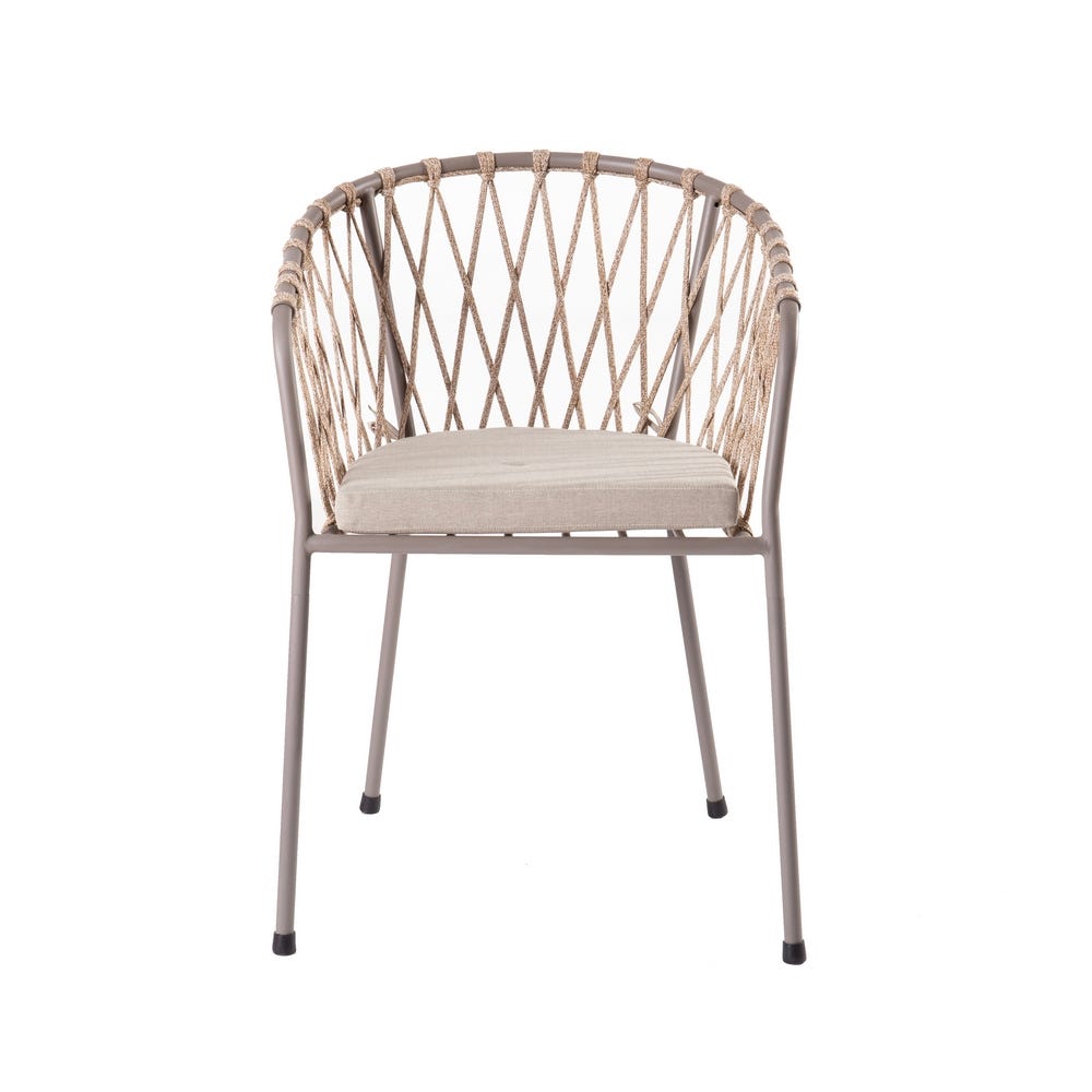Cadeira de jardim com estrutura metálica e cordas. Inclui almofada. Pernas removíveis para facilitar o transporte.