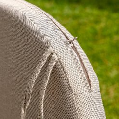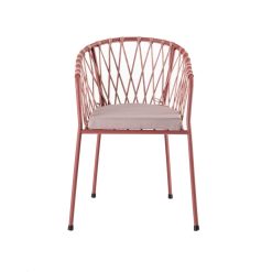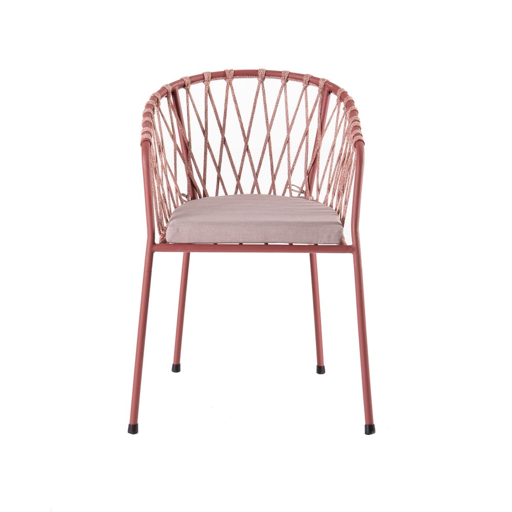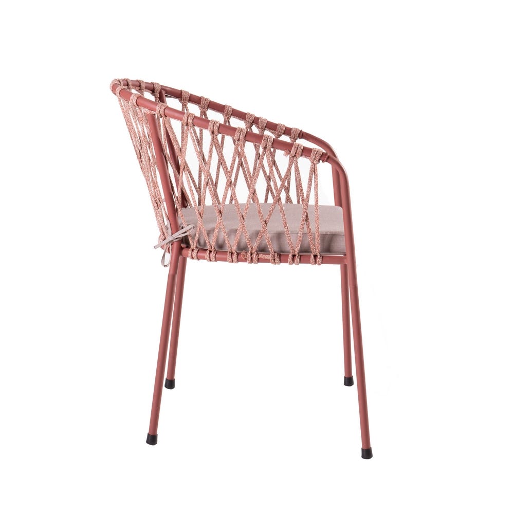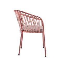 Cadeira de jardim com estrutura metálica e cordas. Inclui almofada. Pernas removíveis para facilitar o transporte.