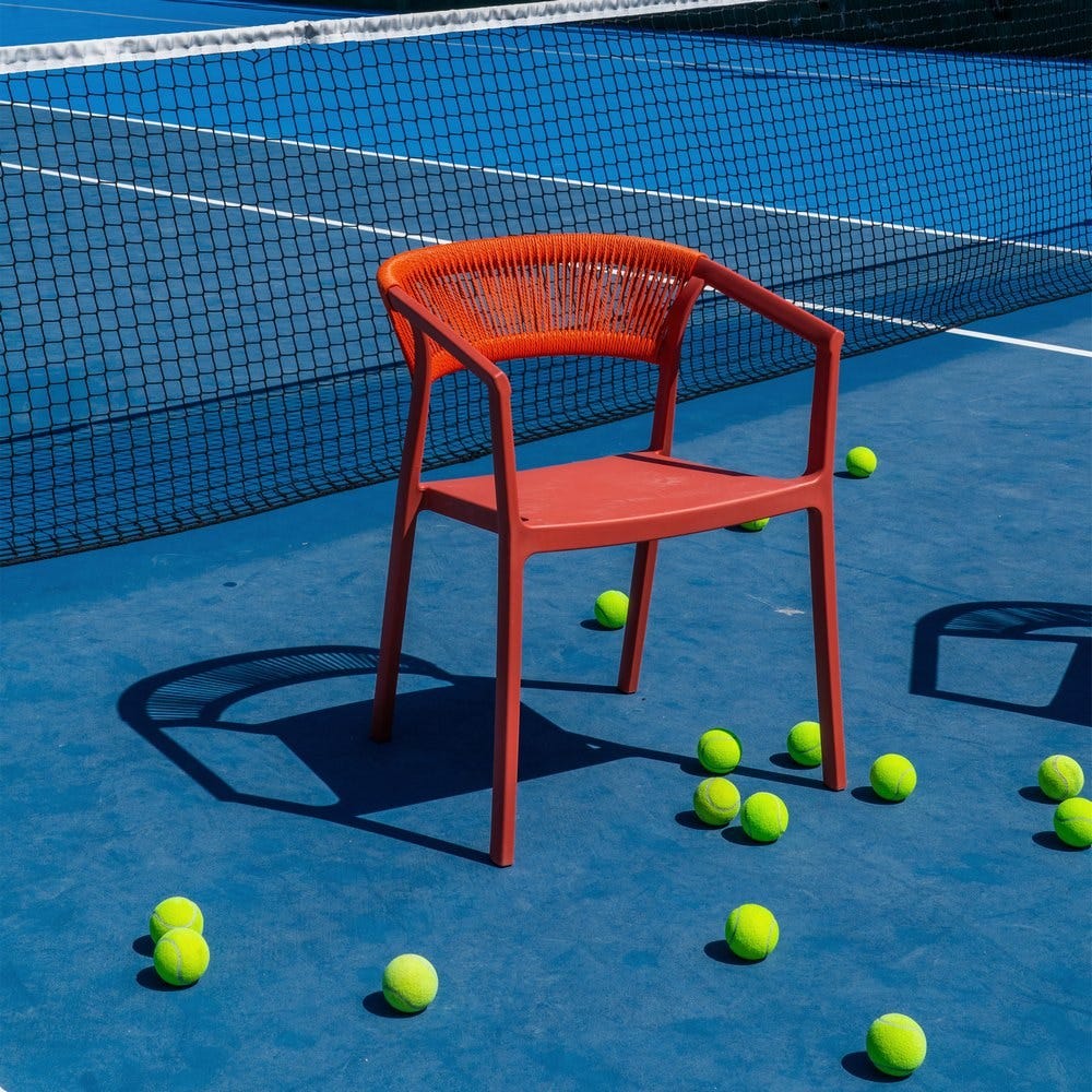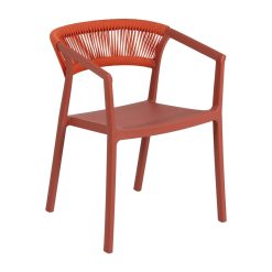 Materiais: Polipropileno, corda de polietileno. Altura das pernas: 42 cm. Altura do encosto: 36 cm. Altura do assento: 45,5 cm. Dimensões do assento: 42,5 x 40,5 cm. Distância entre as pernas: 51 cm. Altura do apoio de braço ao assento: 22 cm (68 cm do chão). Capacidade máxima de peso: 150 kg. Não requer montagem. Empilhável. Em conformidade com a norma UNE-EN 16139:2013.