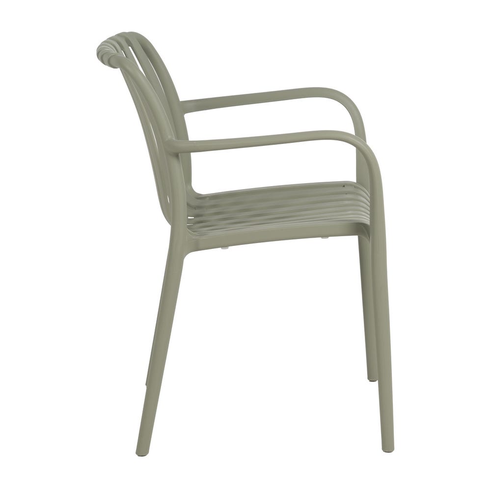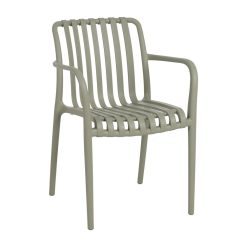 Material: Polipropileno. Altura do assento: 46 cm. Largura do assento: 45 cm. Profundidade do assento: 41 cm. Altura do encosto: 40 cm. Altura do apoio de braço: 20 cm (67 cm do chão). Empilhável. Em conformidade com a norma EN581 (uso externo).