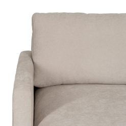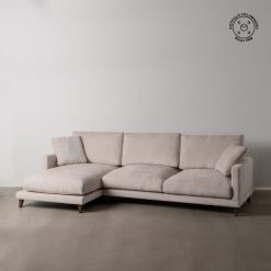 Tecido: Estrutura: madeira de pinho. Suspensão: Correia elástica Nea. Enchimento: assento em fibra com borracha de poliuretano 28kg e encosto em fibra de silicone. Altura do assento: 47cm. Largura do assento: 270cm. Profundidade do assento: 70/125cm. Altura do encosto: 47cm. Altura do apoio de braço: 22cm. Altura da perna: 12cm. Almofadas removíveis.