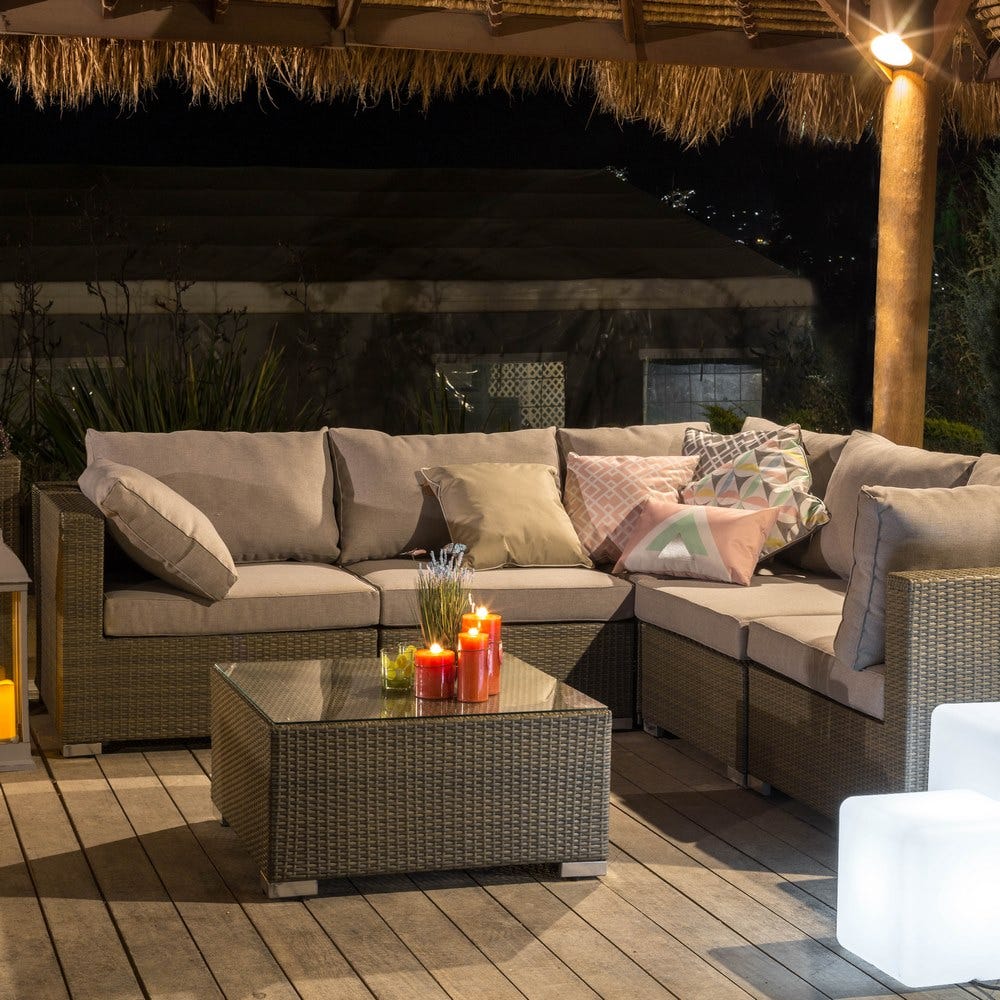 2 módulos iniciais, módulo de canto, 2 módulos intermediários, mesa de 75x75x45cm com tampo de vidro temperado. Almofadas de 10cm com capas removíveis.
