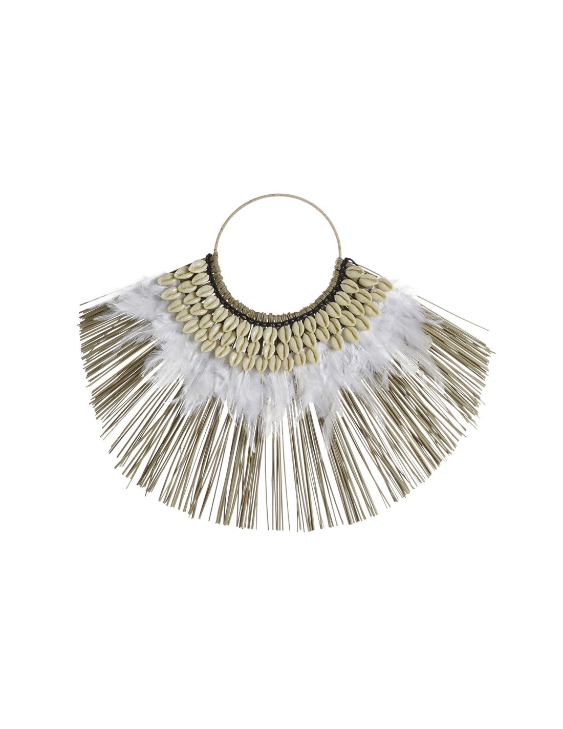 Decoração de parede em fibra e decorada com búzios reais e penas brancas medindo 56 x 36 cm com argola de metal que segura tudo, ideal para decorar a parede da sua casa e dar aquele desenho rústico que você deseja.