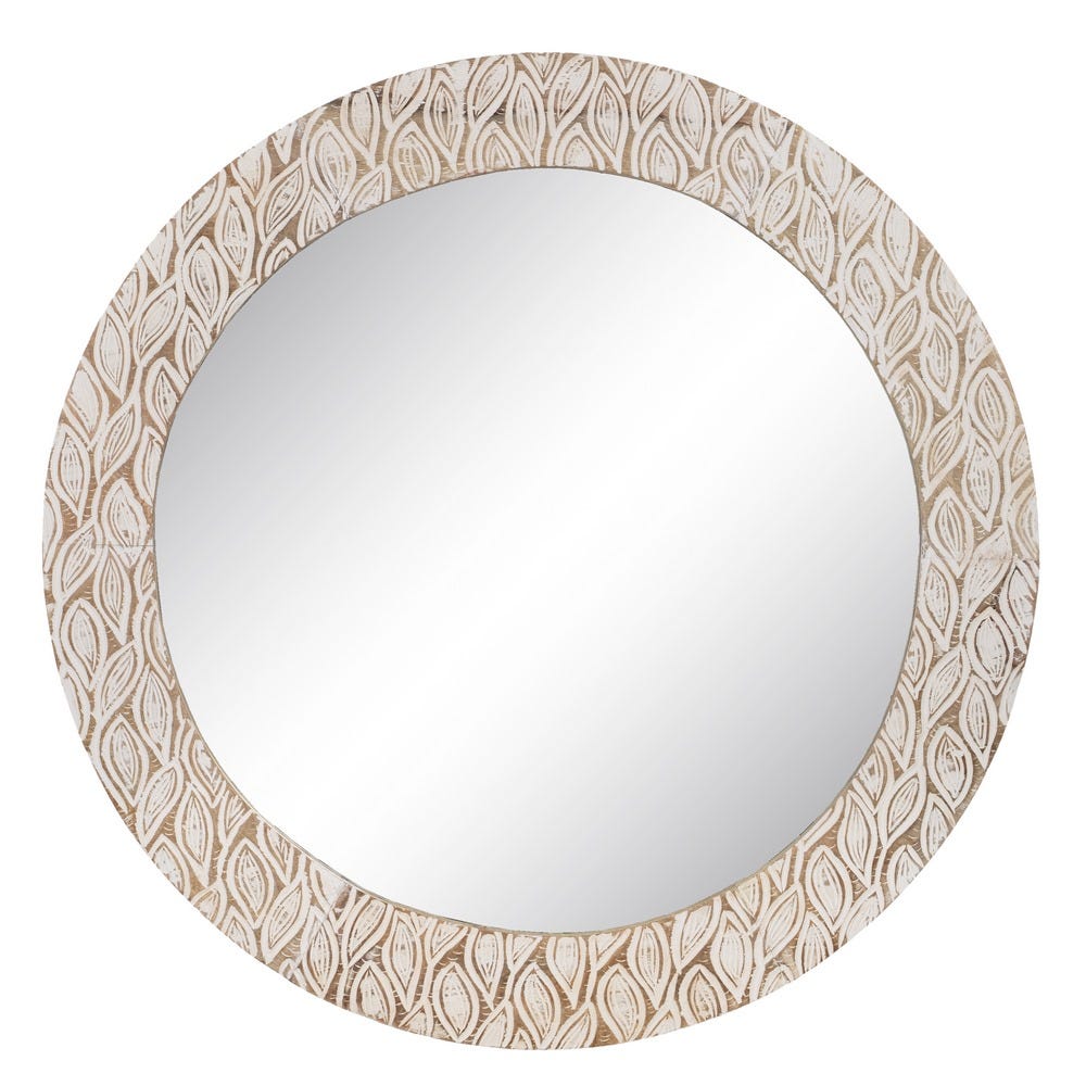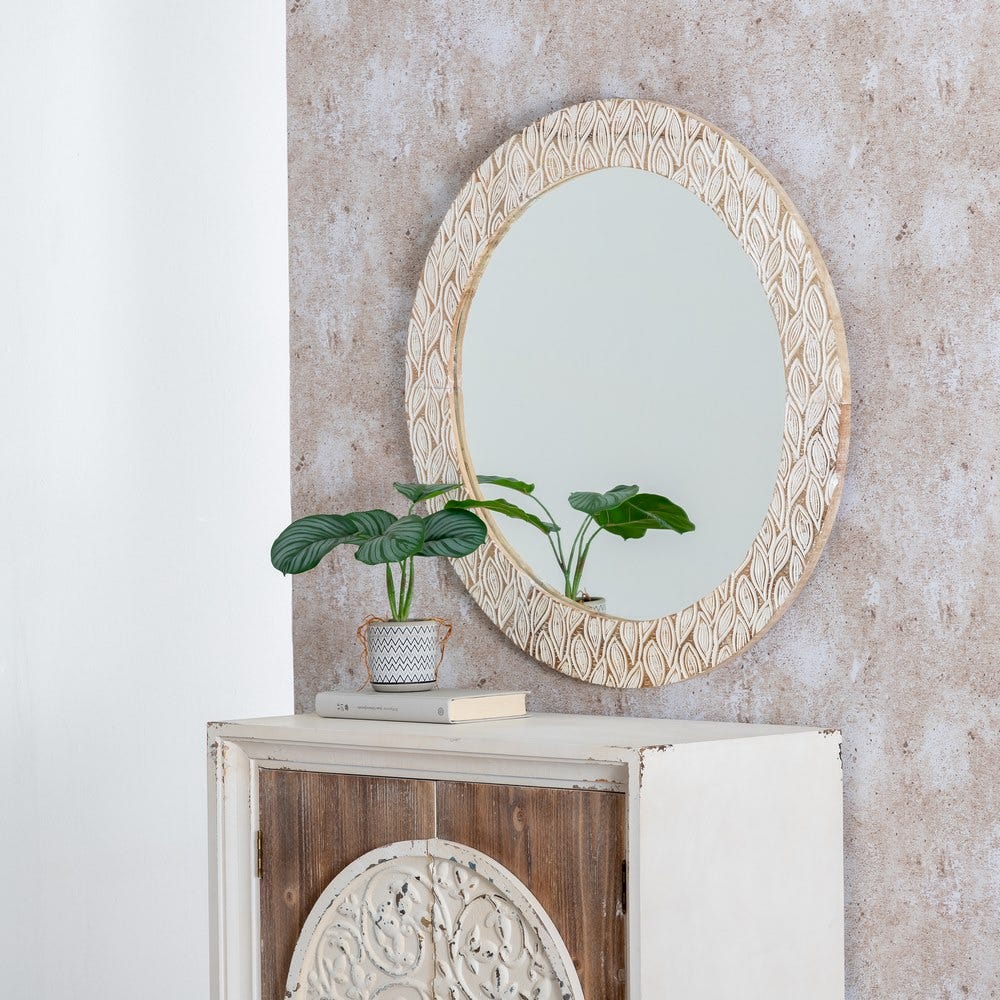 Material da moldura: madeira de mangueira. Diâmetro interno do espelho: 58 cm. Inclui suporte para fixação adequada.
