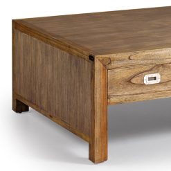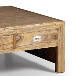 Mesa de centro da coleção Merapi, feita à mão em madeira de mindi e acessórios em bronze. A cor das alças é prata. Uma mesa prática com 4 gavetas, ideal para manter a ordem na sala de estar. Sem necessidade de montagem.