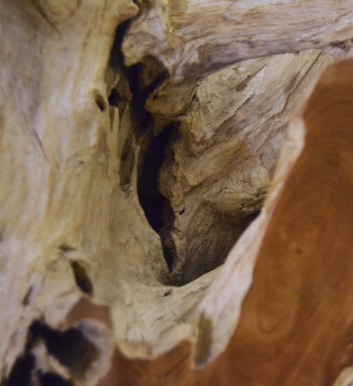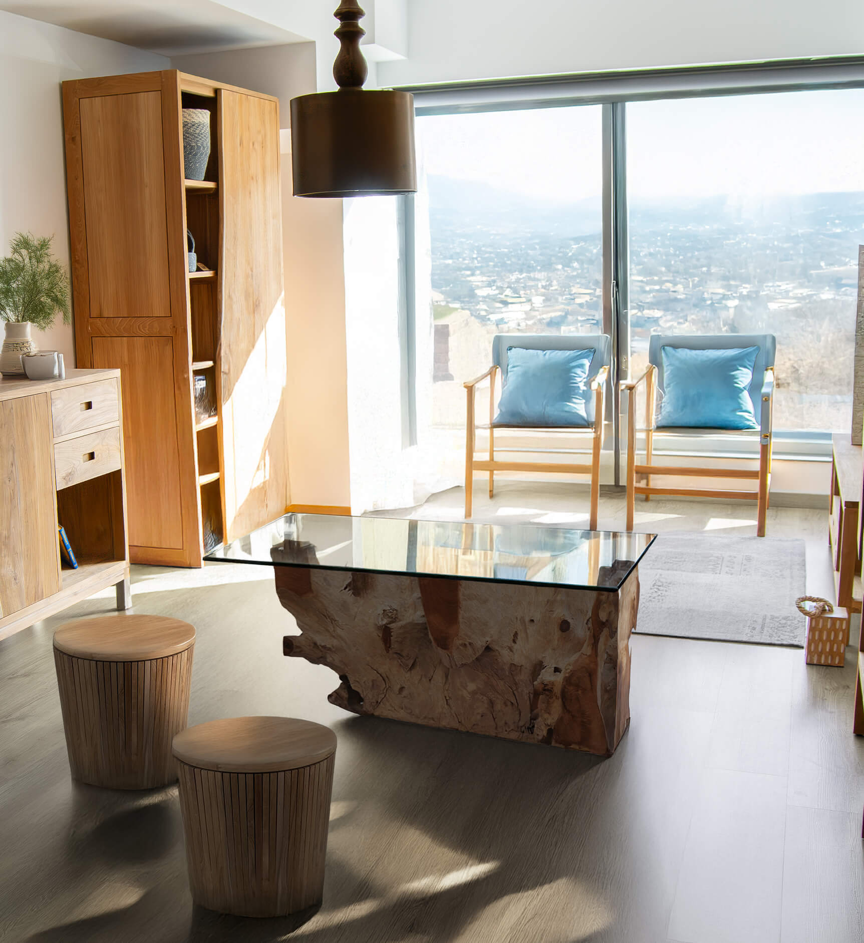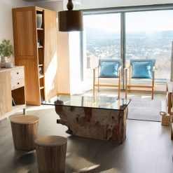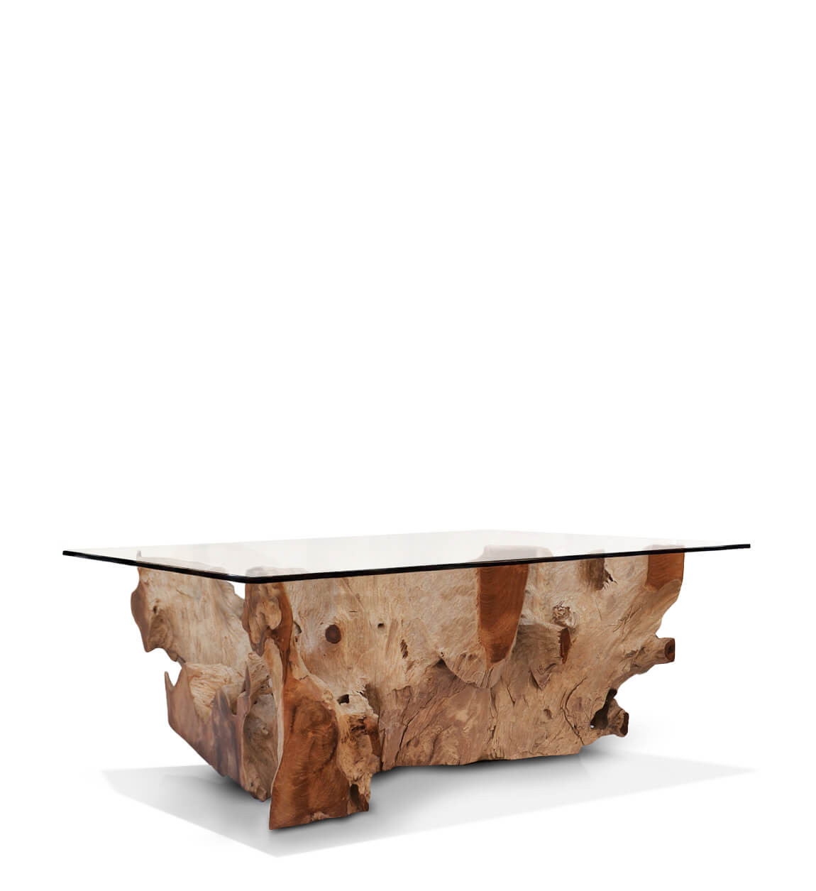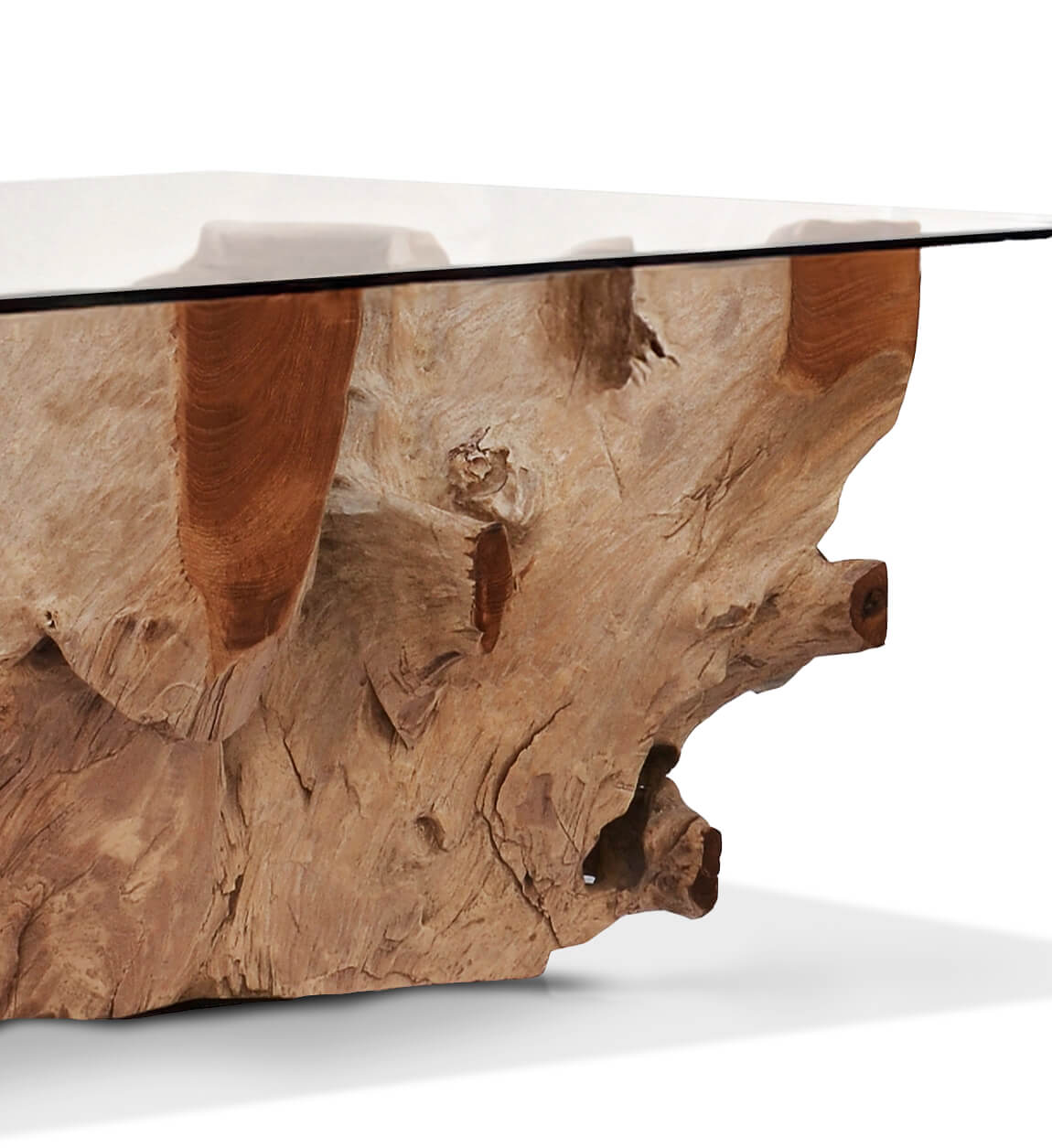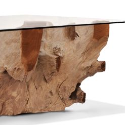 Mesa de centro em raiz de teca branqueada com vidro 120 x 75 x 45