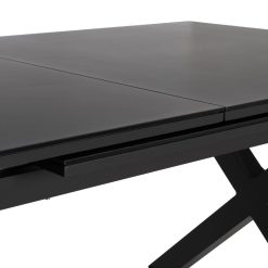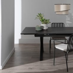 Mesa extensível, de 180 cm a 240 cm (+60 cm). Material: vidro com cerâmica, pés de alumínio.