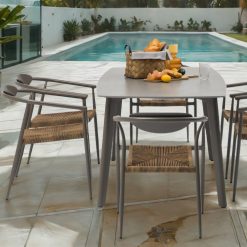 Mesa com 72 cm de altura, 90 cm de largura e 180 cm de comprimento. Tampo em porcelana com 12 mm de espessura e estrutura em alumínio. Capacidade para acomodar 4 cadeiras Tanya nas laterais e 2 nas extremidades.