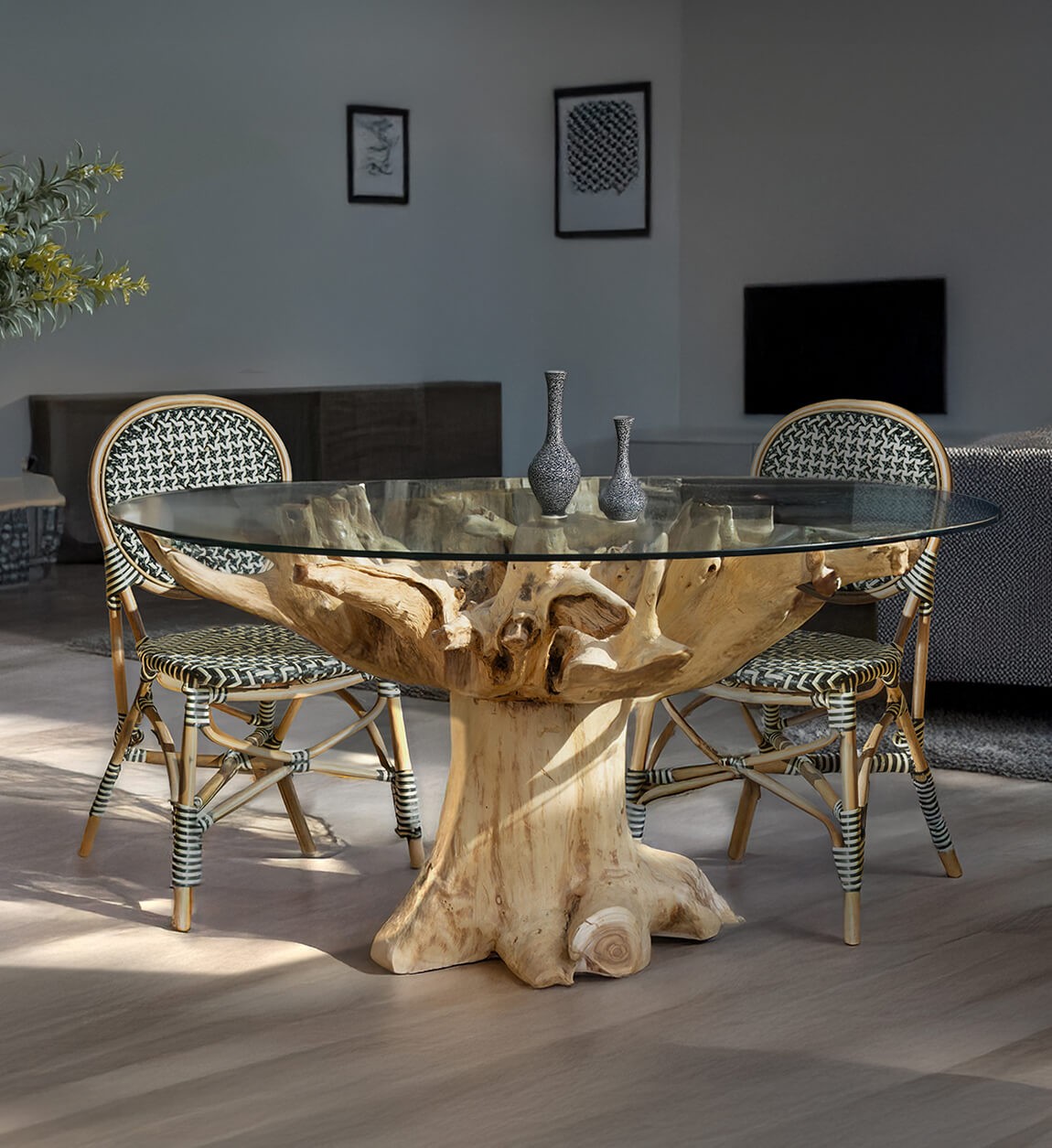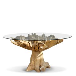 Mesa de raiz de teca e vidro 150 x 150 x 78