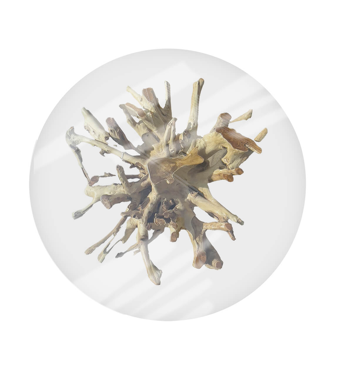 Mesa de jantar raiz branqueada. Feito à mão com madeira maciça de teca bege. Inclui o vidro de 150 x 150 cm. A medida da raiz é aproximadamente 120 x 120 x 78. Por ser um produto artesanal com produtos naturais, pode apresentar variações de cor e forma. Sem necessidade de montagem.