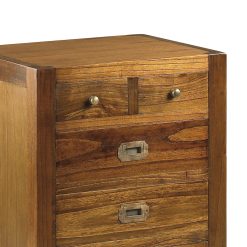 Mesa incluída na colecção Star. Confeccionada artesanalmente com madeira maciça de mindi e acessórios em bronze. Tem três gavetas grandes e cinco gavetas pequenas. Sem necessidade de montagem.