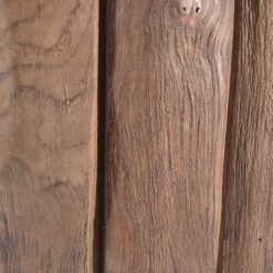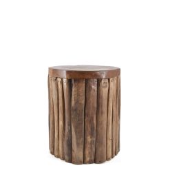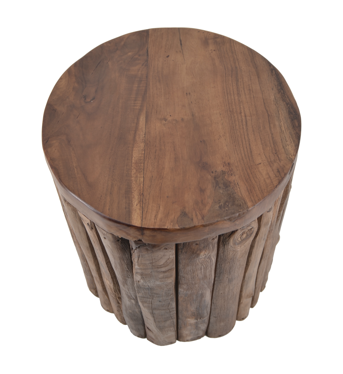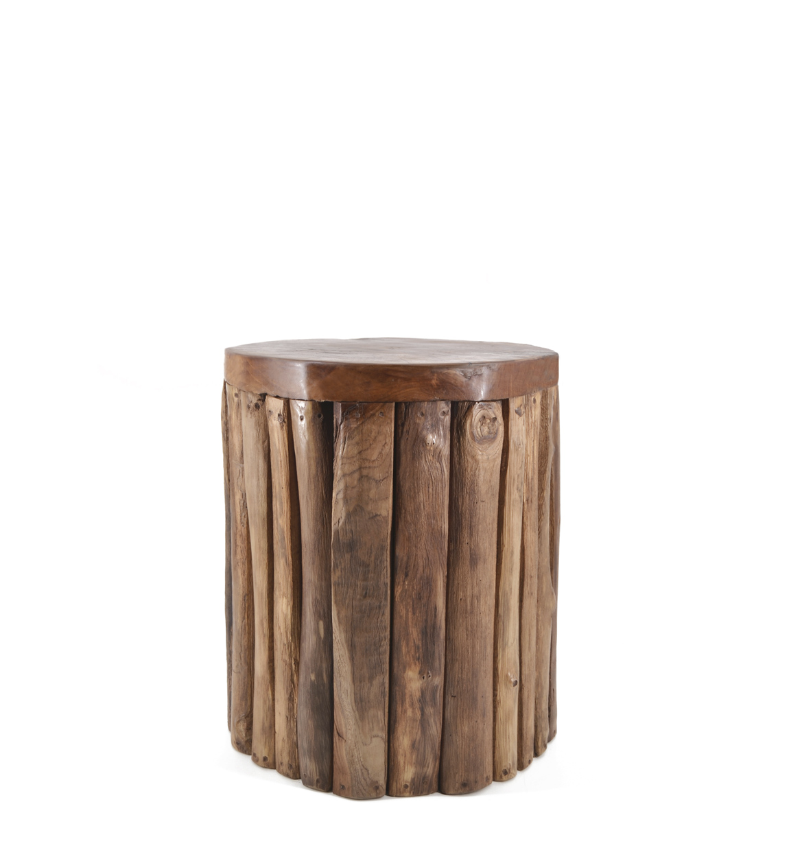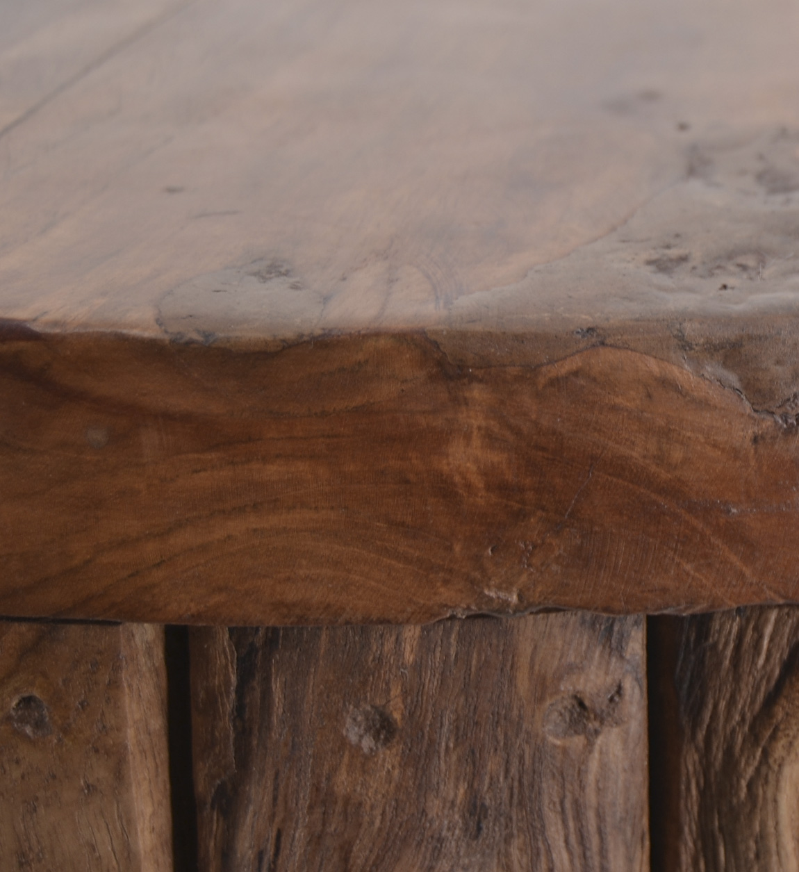 Mesa redonda muito original feita de troncos verticais, feita à mão com madeira de teca. Por ser feito com produtos naturais, pode apresentar variações de forma e cor. Sem necessidade de montagem.