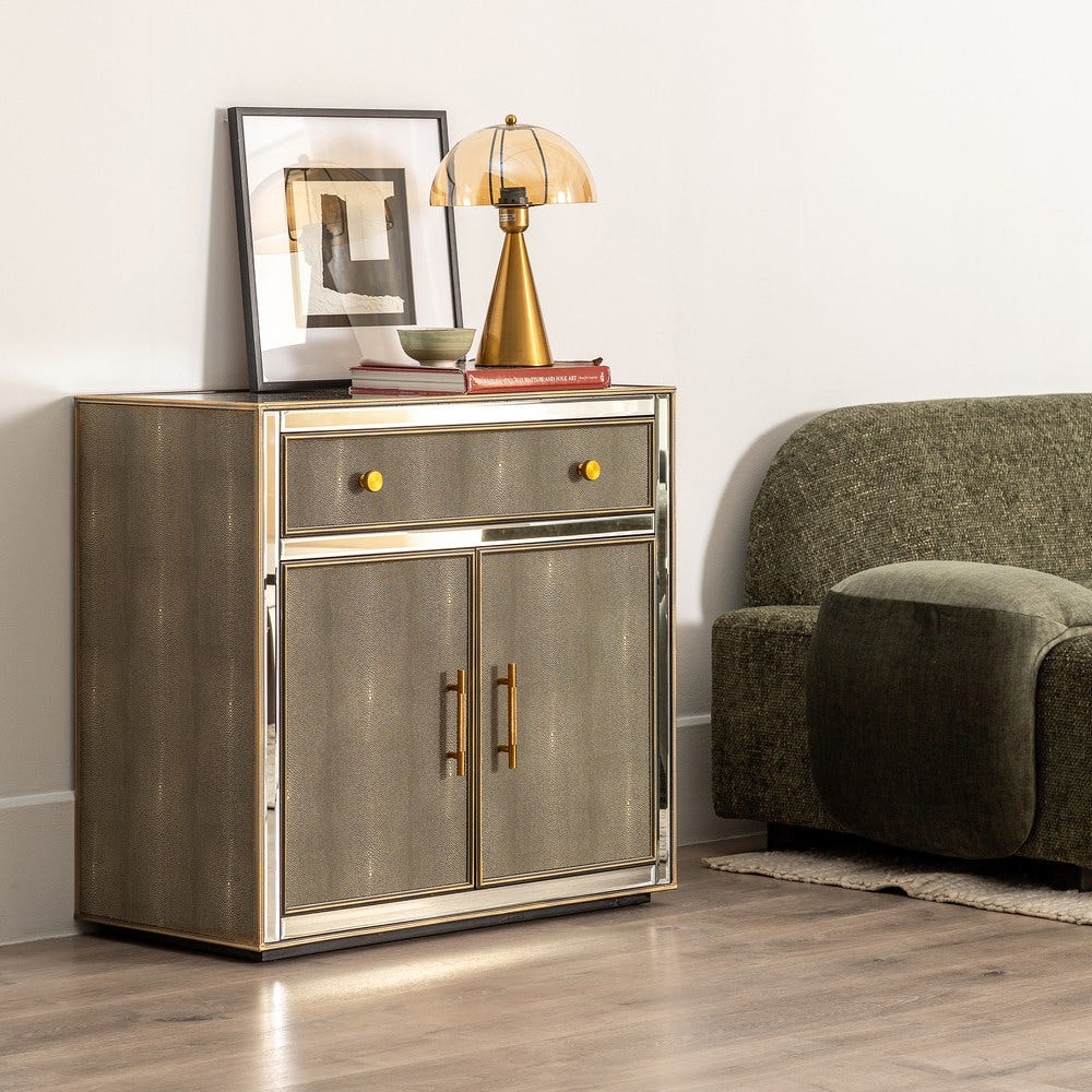 Material: MDF – vidro – couro sintético. Dimensões da porta: 36 x 48,5 cm. Dimensões da gaveta: 72 x 14 cm.