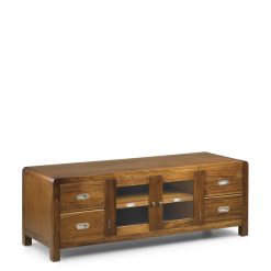 Móvel de TV incluído na coleção Flash. Feito à mão em madeira mindi, com estrutura sólida e acessórios em bronze prateado. Tem 4 gavetas, 2 portas de vidro com 1 prateleira interior. Sem necessidade de montagem.