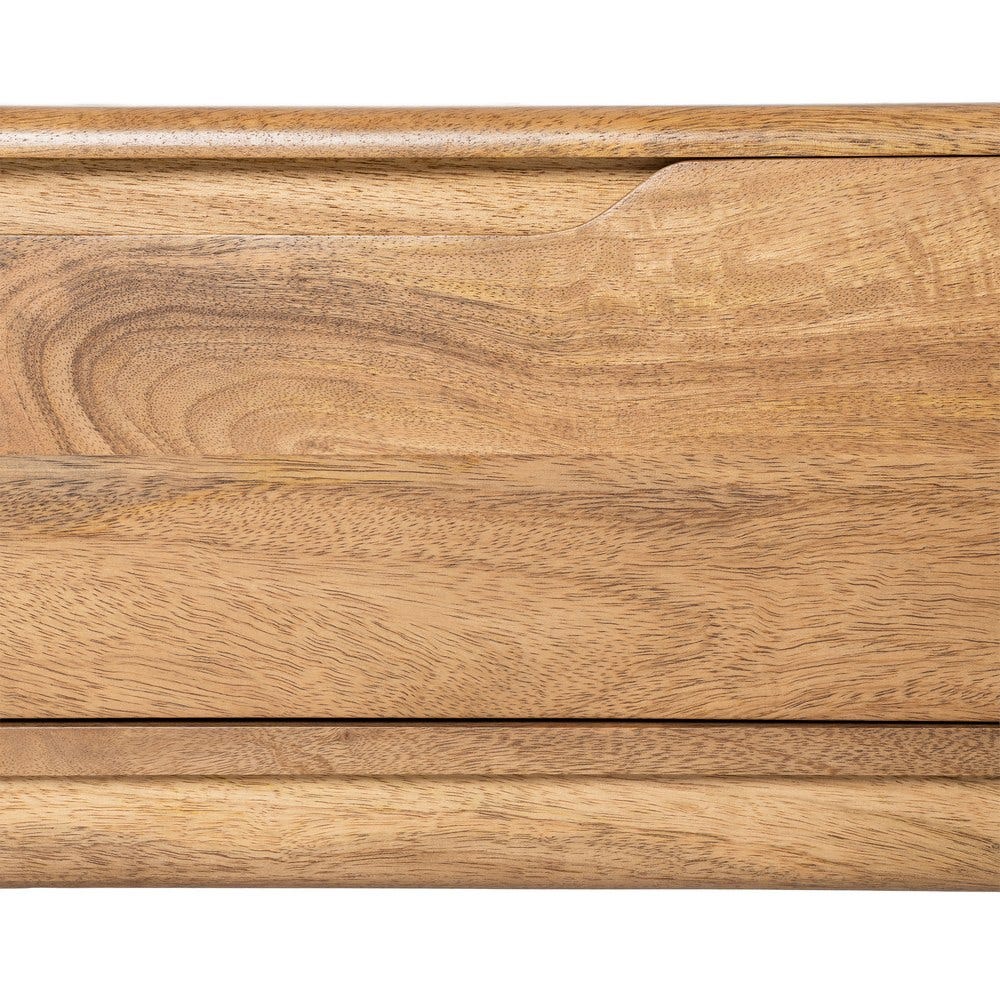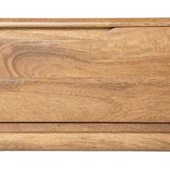 Madeira de mangueira. Os pés requerem montagem. Possui três gavetas: 47,5 x 10,5 cm. Altura dos pés: 17,5 cm.