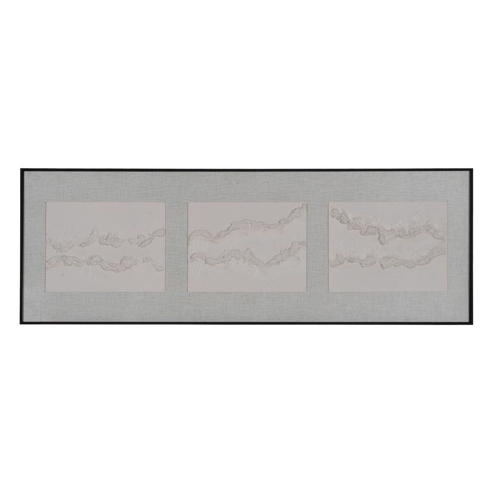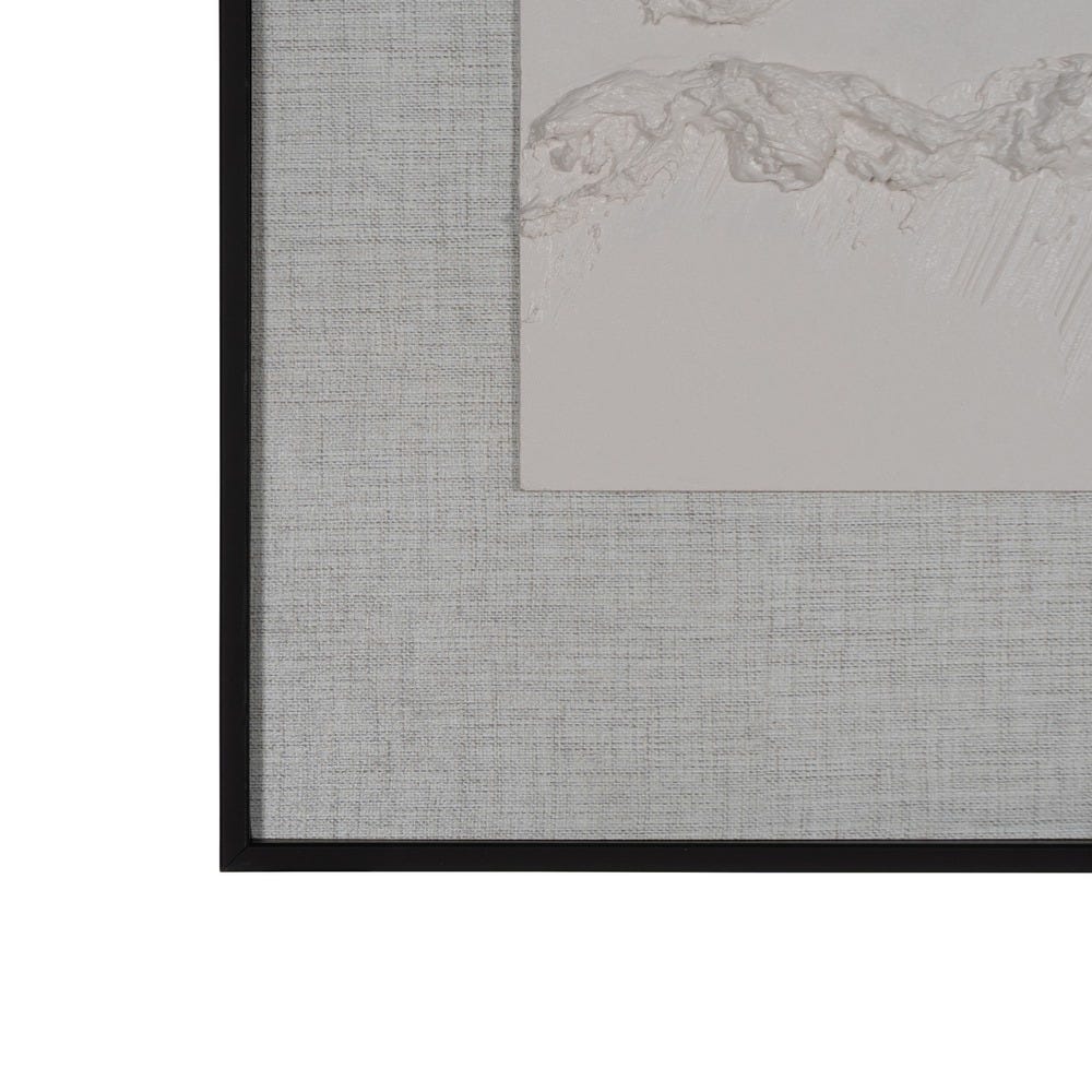 Tinta à base de água sobre pasta de relevo à base de água com texturas. Papel de impressão cor champanhe. Moldura piramidal branca de 1,5 x 4 cm.