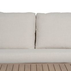 Material: alumínio. Inclui 1 sofá (183x96x88cm), 2 poltronas (83x96x88cm) e 1 mesa de centro (122,5x60x35cm). Altura do assento: 44cm. Largura do assento: 163cm (sofá)/63cm (poltronas). Profundidade do assento: 52cm. Altura do encosto: 53cm. Altura do apoio de braço: 14cm. Altura das pernas: 25,5cm (frente)/11,5cm (traseira). Altura da perna da mesa: 26,5cm. Almofadas: 300gr/m2, poliéster reciclado (capas removíveis). Móveis e produtos de exterior são adequados para permanecer ao ar livre durante a temporada, porém é recomendável colocá-los sob um telhado ou protegê-los da chuva, pois o tecido não é impermeável. Terminada a temporada, recomenda-se armazená-lo ou protegê-lo adequadamente para garantir sua manutenção.
