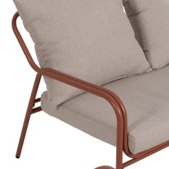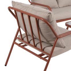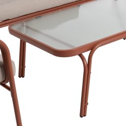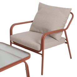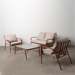 Inclui 1 sofá (122×68,5x75cm), 2 poltronas (64×68,5x75cm) e 1 mesa de centro (100x65x36cm). Estrutura de aço. Tampo de mesa em vidro temperado. Tecido 100% olefina. Enchimento de espuma de 6cm + algodão de 2cm. Apenas as almofadas do assento são removíveis. Altura do assento: 40cm. Largura do assento: 54cm (poltronas) e 113cm (sofá). Profundidade do assento: 40cm. Altura do apoio de braço: 15cm. Cumpre a norma EN581 (uso externo). Móveis e produtos de exterior são adequados para permanecer ao ar livre durante a temporada, porém é recomendável colocá-los sob um telhado ou protegê-los da chuva, pois o tecido não é impermeável. Terminada a temporada, recomenda-se armazená-lo ou protegê-lo adequadamente para garantir sua manutenção.