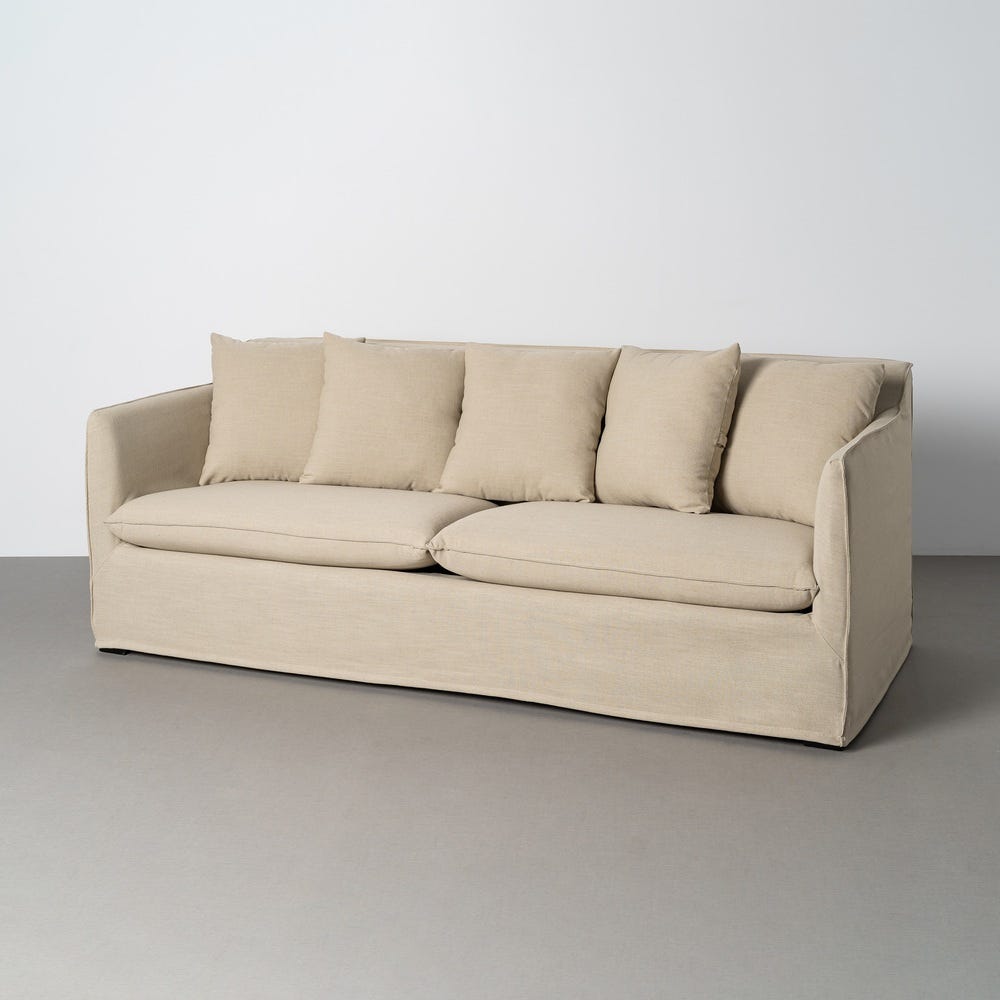 Sofá com capa removível. Tecido: 58% poliéster reciclado, 34% poliéster, 8% linho. Estrutura em madeira maciça e aglomerado revestido com espuma de poliuretano. Almofada do assento em espuma sanduíche com densidade de 28 e 35 kg/m³. Encosto preenchido com fibra oca siliconizada. Suspensão do assento e encosto com cintas elásticas. Altura do assento: 44 cm. Largura do assento: 193 cm. Profundidade do assento: 50 cm. Altura do encosto: 50 cm. Altura do apoio de braço: 30 cm. Lavável na máquina a no máximo 40 °C. Não usar alvejante. Não passar a ferro. Secar na secadora em temperatura média. Lavagem a seco permitida. Lavagens frequentes podem afetar as propriedades do produto.